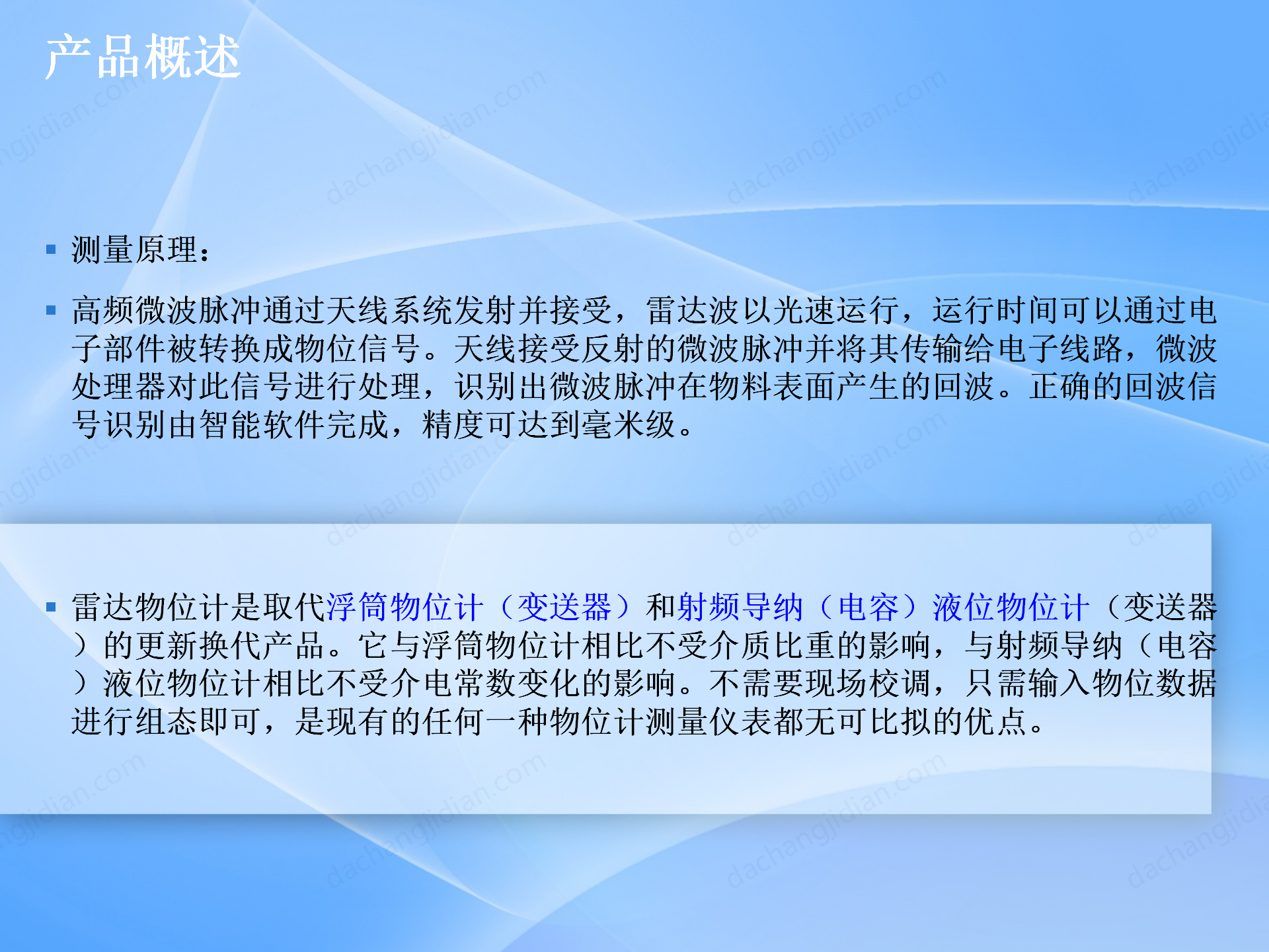 雷達物位計是取代浮筒物位計(變送器)和射頻導納(電容)液位物位計(變送器)的更新換代產品。它與浮筒物位計相比不受介質比重的影響,與射頻導納(電容)液位物位計相比不受介電常數變化的影響。不需要現場校調,只需輸入物位數據進行組態即可,是現有的任何一種物位計測量儀表都無可比擬的優點。